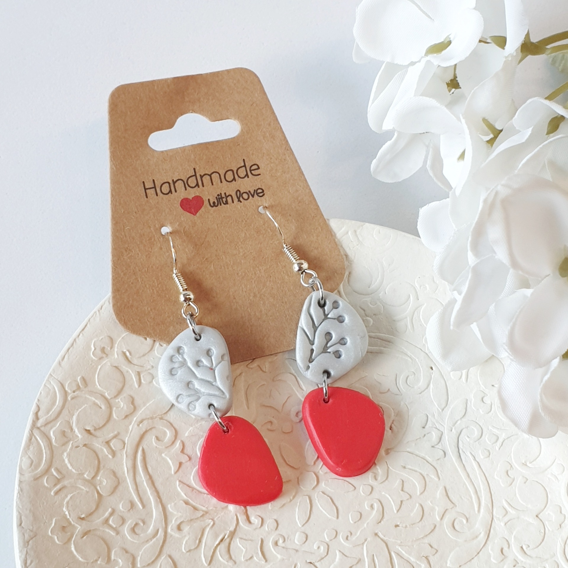 Realce o seu estilo com estes elegantes brincos artesanais, criados em argila polimérica com acabamento moderno e sofisticado. A combinação do vermelho vibrante com o padrão mármore em cinza garante um visual único e cheio de personalidade.