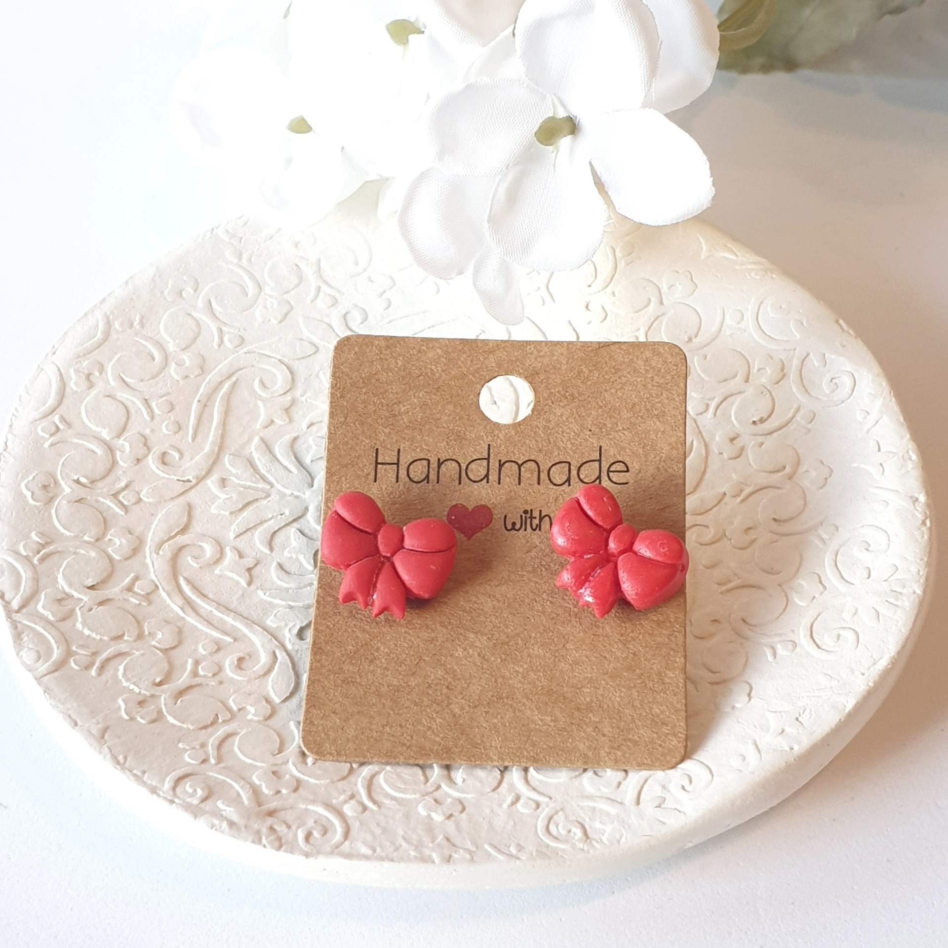 Brincos formato de laço. Feitos à mão com massa Fimo.Leves e confortáveis para o uso diário.