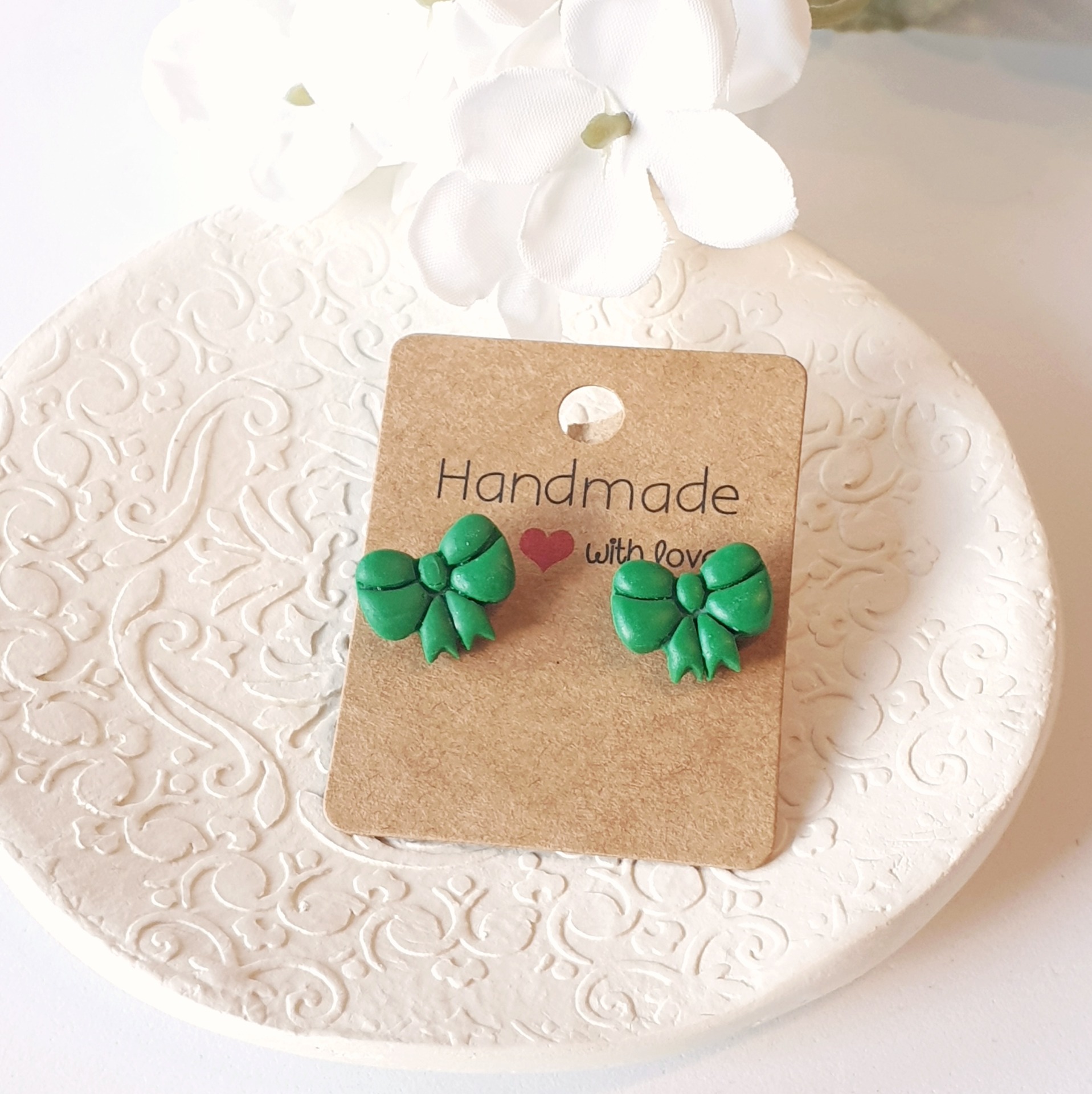 Brincos formato de laço. Feitos à mão com massa Fimo.Leves e confortáveis para o uso diário.