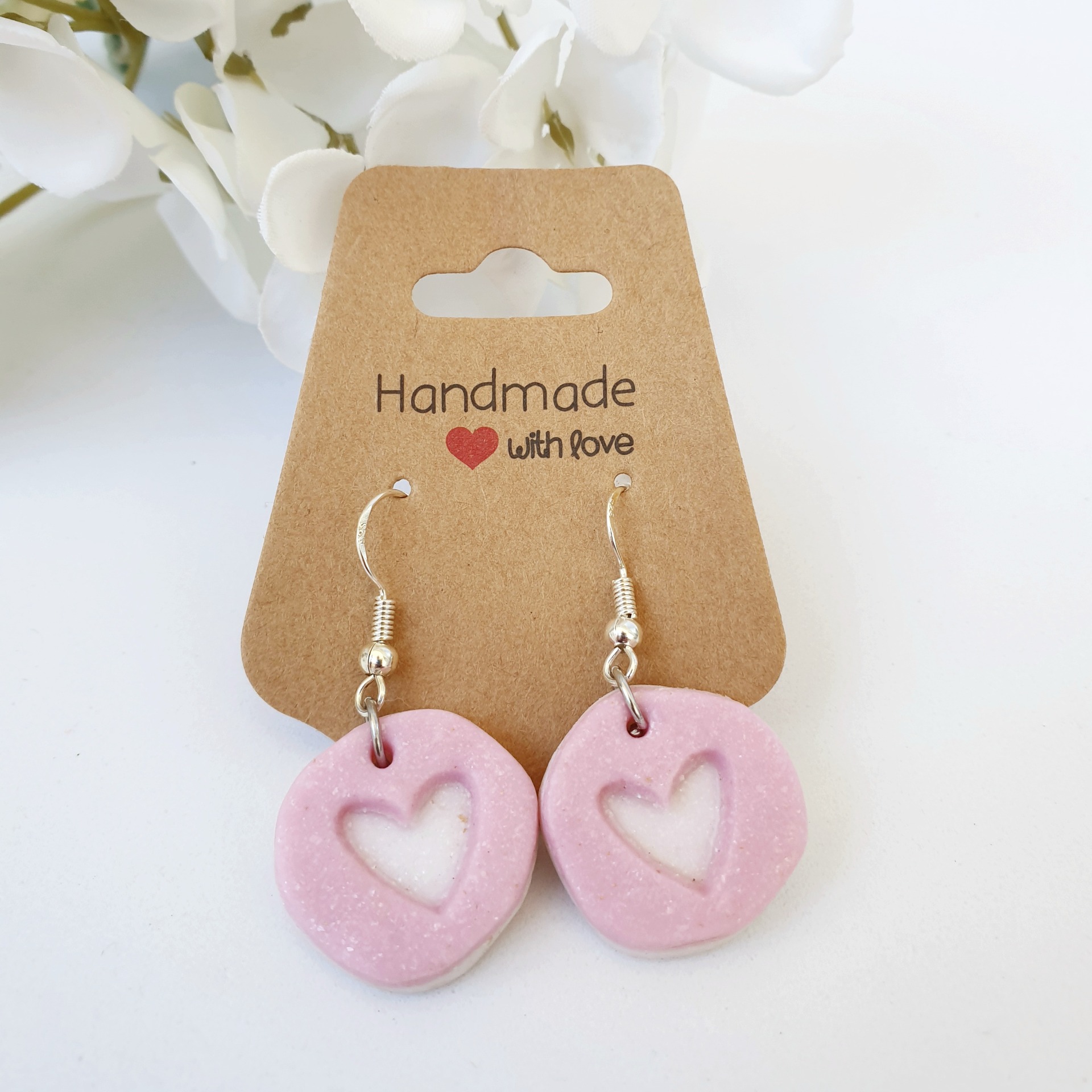 Estes encantadores brincos pendentes combinam um design romântico com uma estética delicada e vintage. Peça redonda, com o seu suave tom rosa pastel, é cuidadosamente moldada para se assemelhar a uma pequena bolacha ou doce, com um coração vazado que revela o tom branco no fundo.