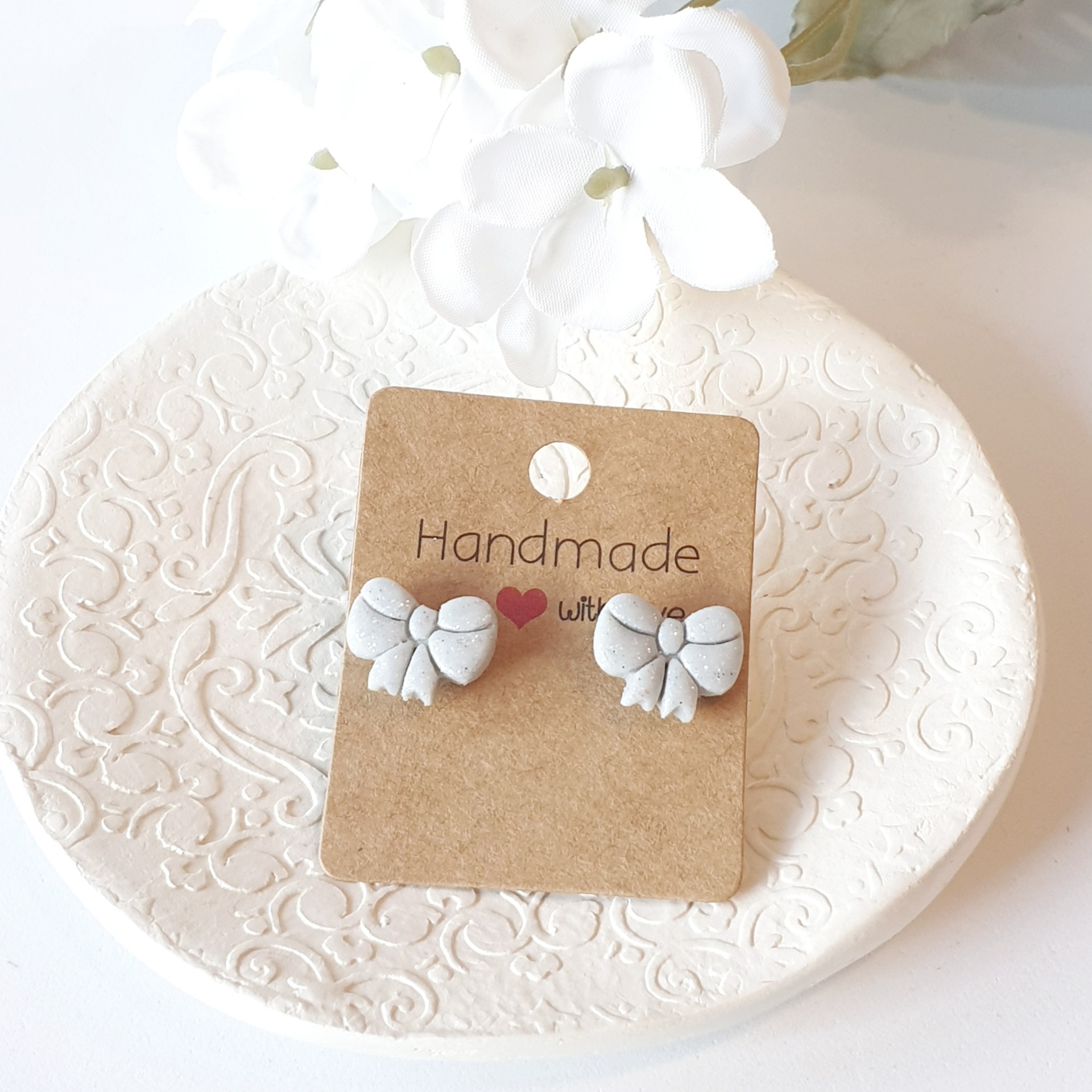 Delicados e charmosos, esses brincos em formato de laço são perfeitos para quem ama um toque feminino e artesanal no visual. Feitos à mão em argila polimérica.