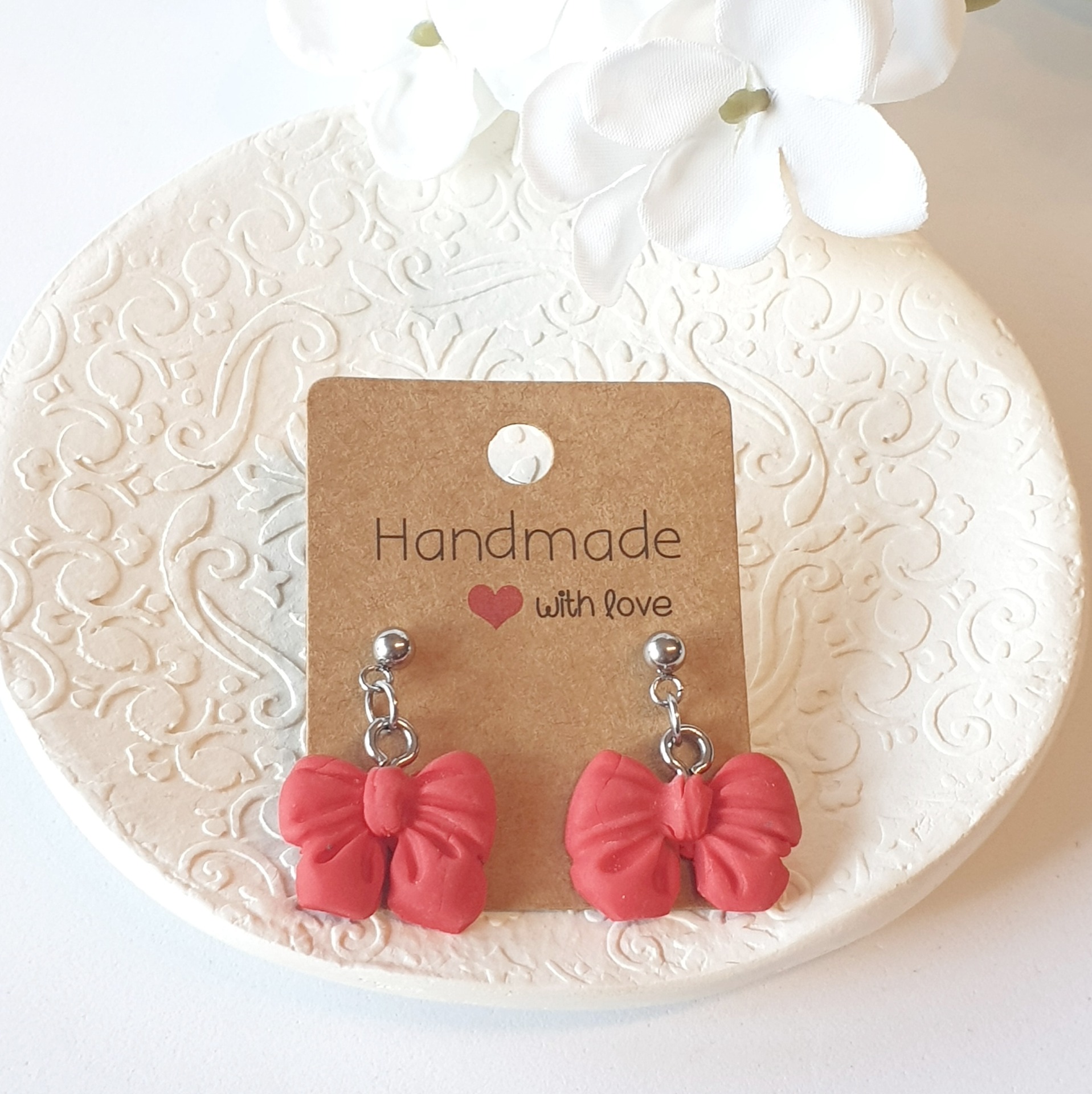 Delicados e charmosos, esses brincos em formato de laço são perfeitos para quem ama um toque feminino e artesanal no visual. Feitos à mão em argila polimérica.
