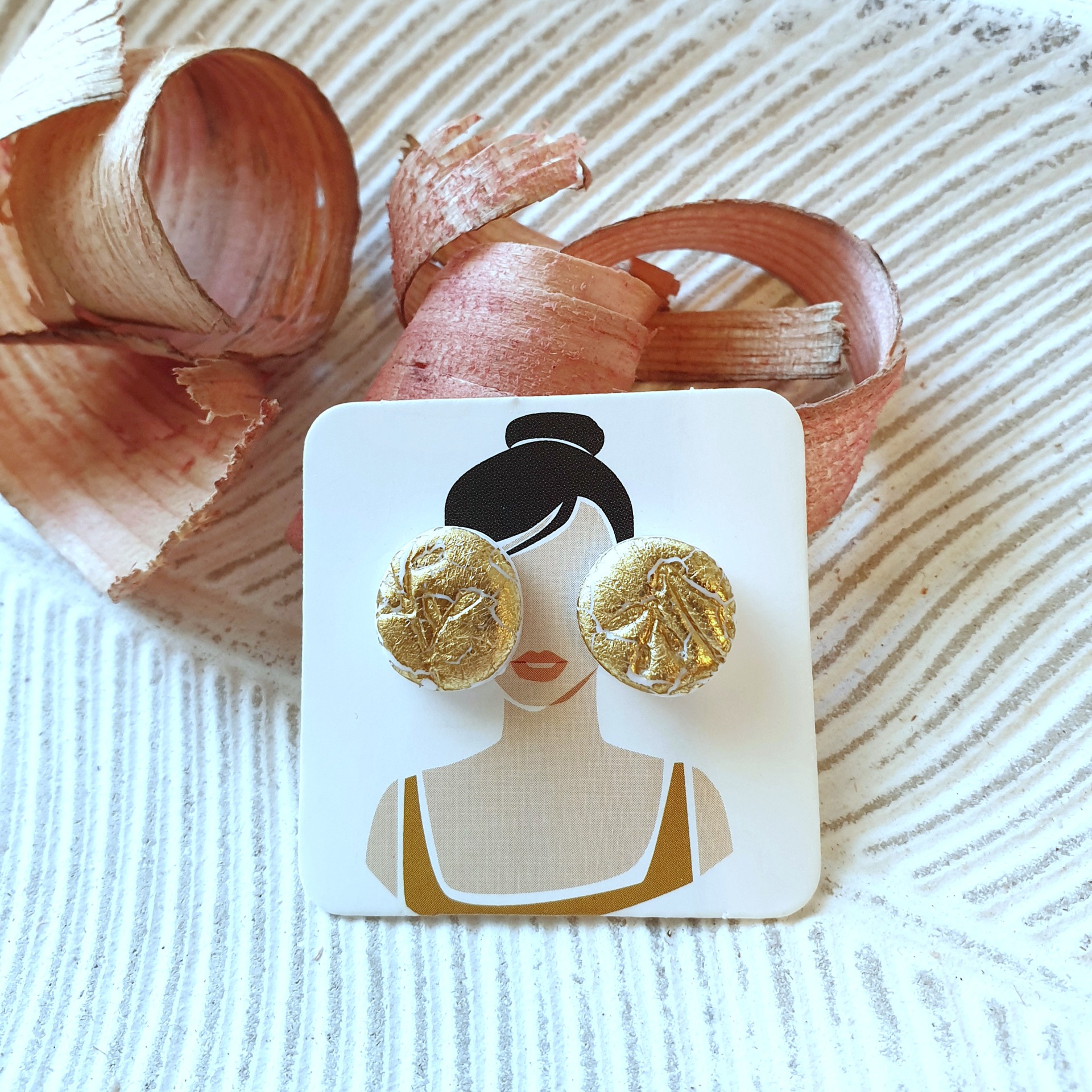 Brincos redondos e pequenos com folha de ouro. Feitos à mão com massa Fimo.Leves e confortáveis para o uso diário.