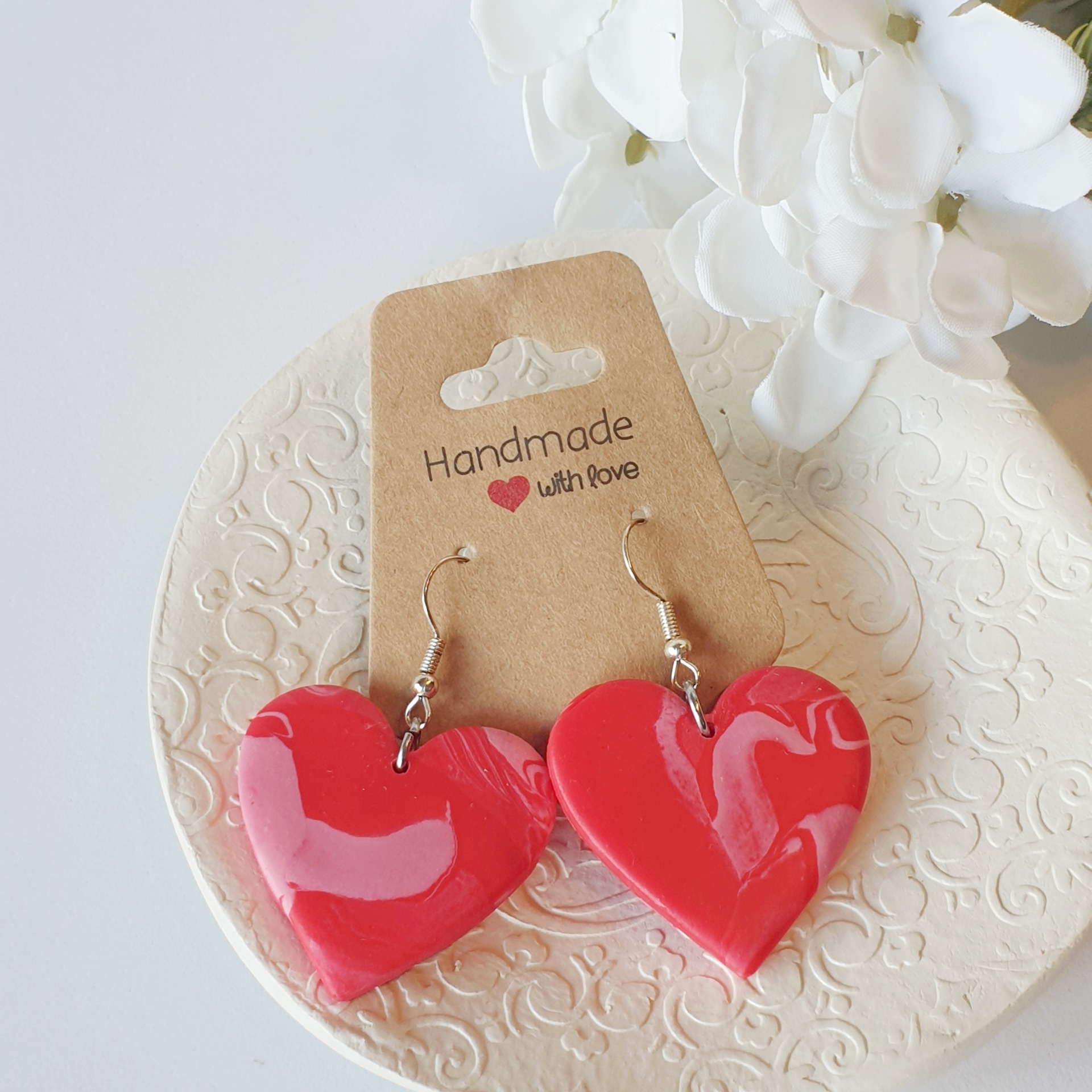 Brincos com formato de coração com mistura de cores vermelho e rosa. Alegres para o dia a dia. Feitos à mão com atenção aos detalhes garantem conforto, durabilidade e um visual único.