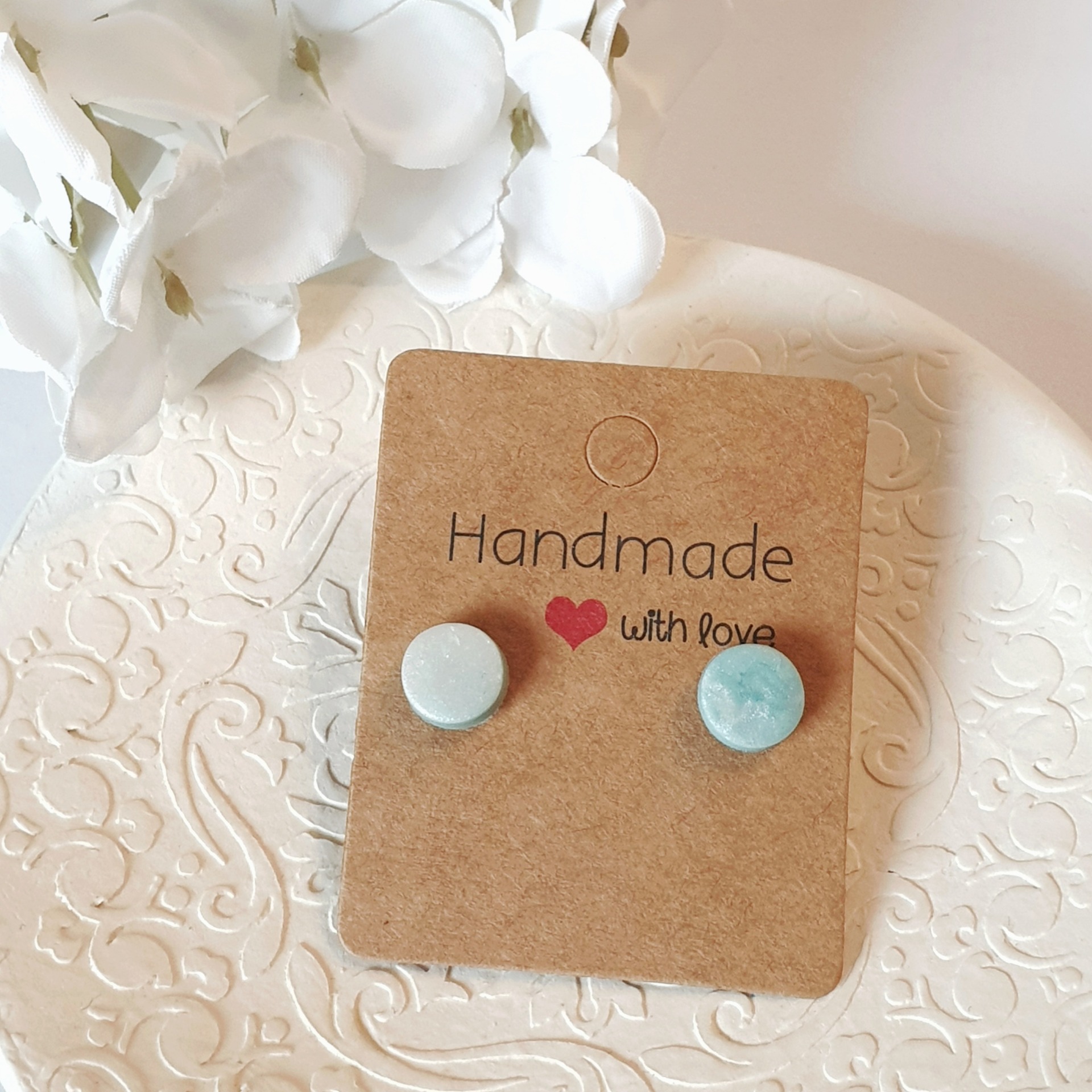 Brincos redondos em argila polimérica. Um acessório artesanal que combina leveza e durabilidade com um acabamento contemporâneo no tom azul pastel.