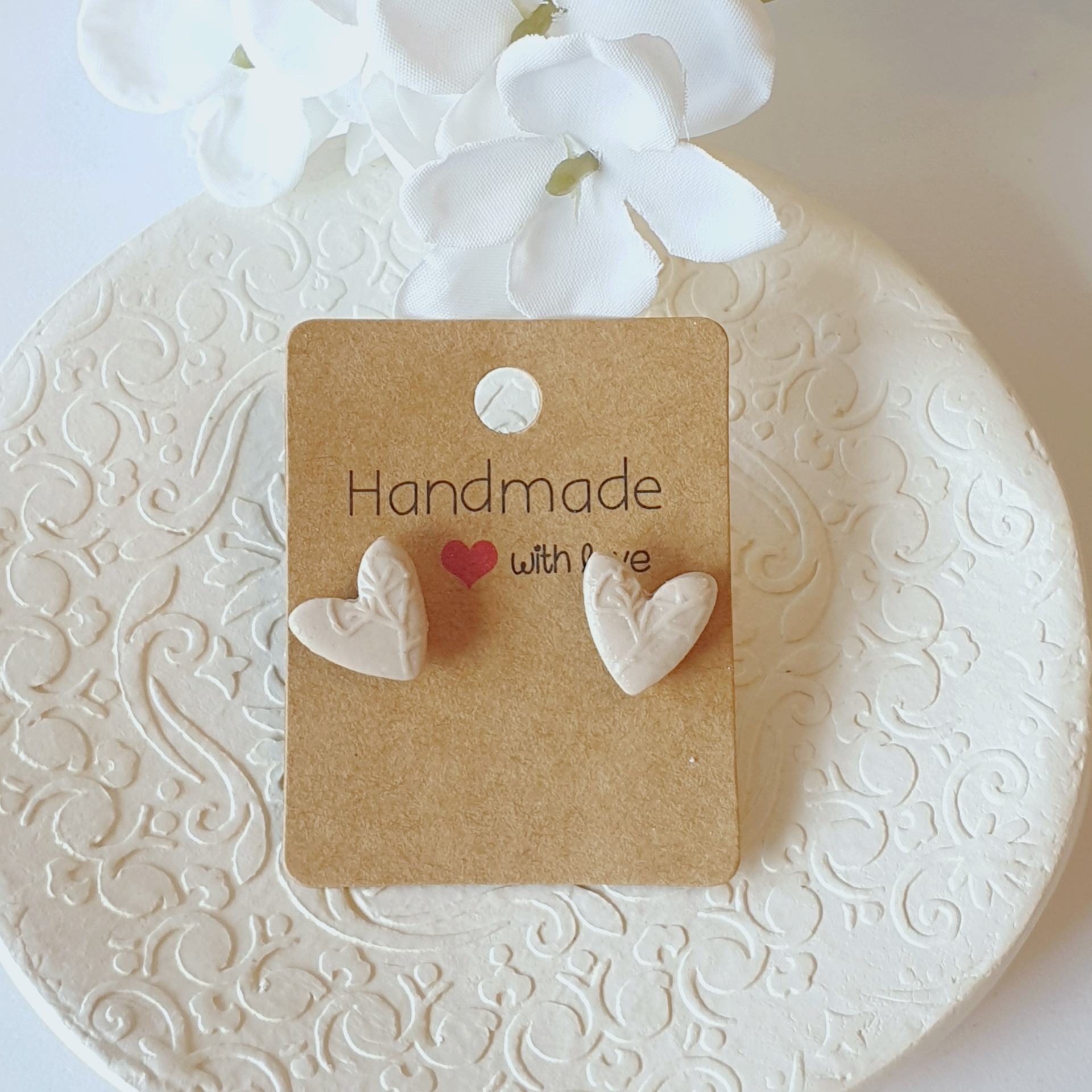 Brincos em formato de coração. Feitos à mão com massa Fimo. Leves e confortáveis para o uso diário.