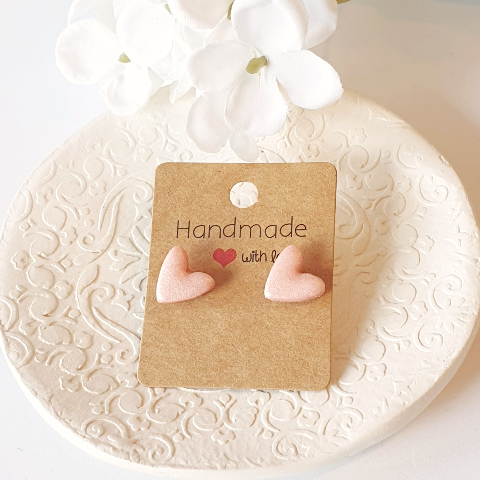 Brincos formato coração cor de rosa, feitos à mão com massa Fimo. Leves e confortáveis para o uso diário.