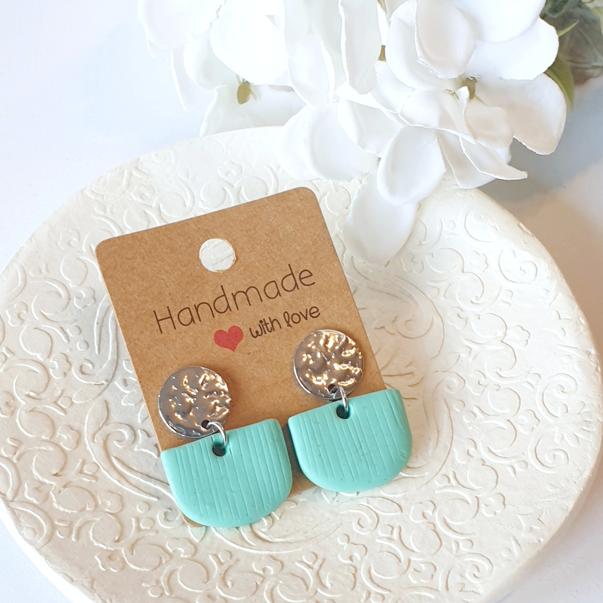 Brincos feitos à mão com massa Fimo com aplique redondo prateado.Leves e confortáveis para o uso diário.