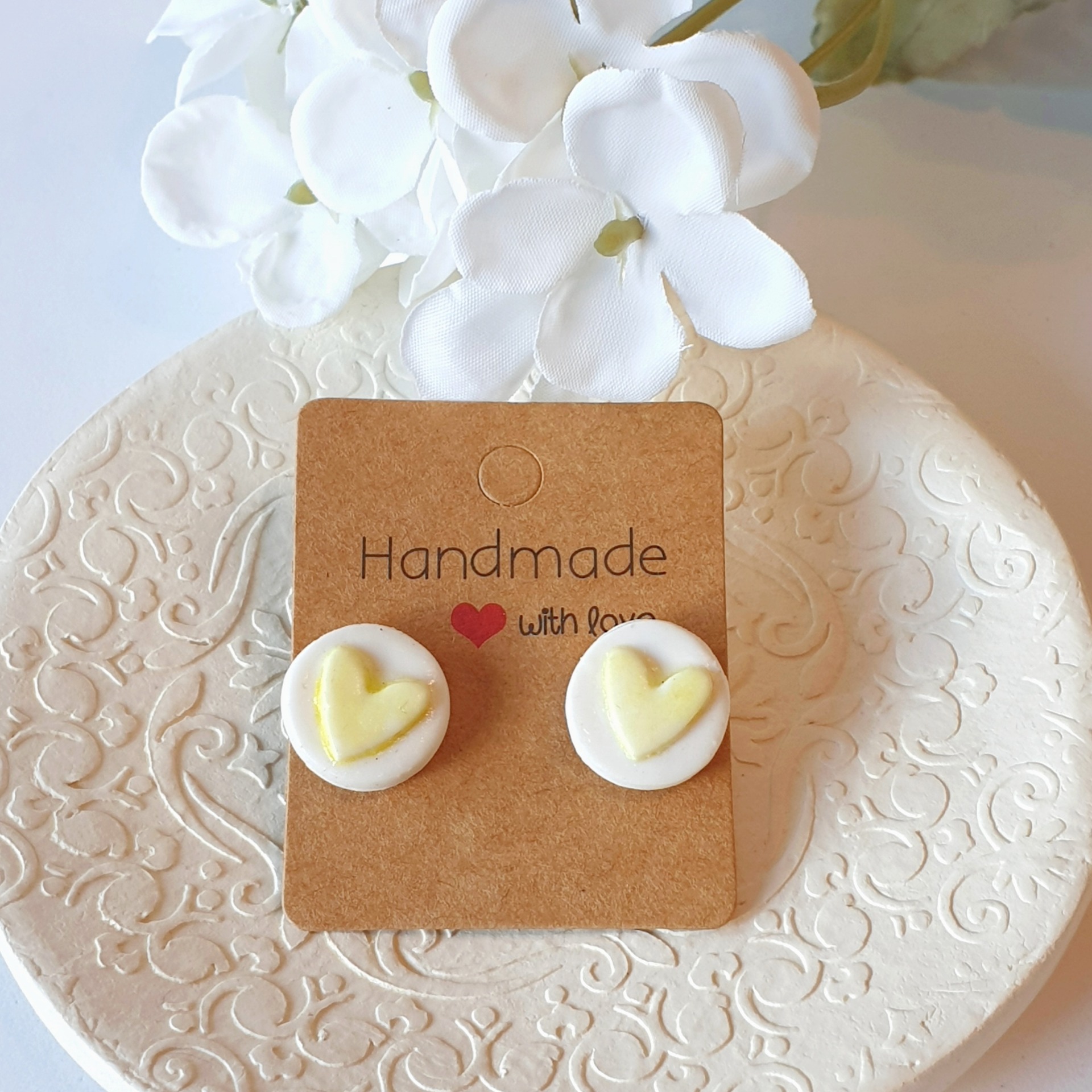 Brincos redondos com coração amarelo no centro.Extra leves a usar e feitos à mão.