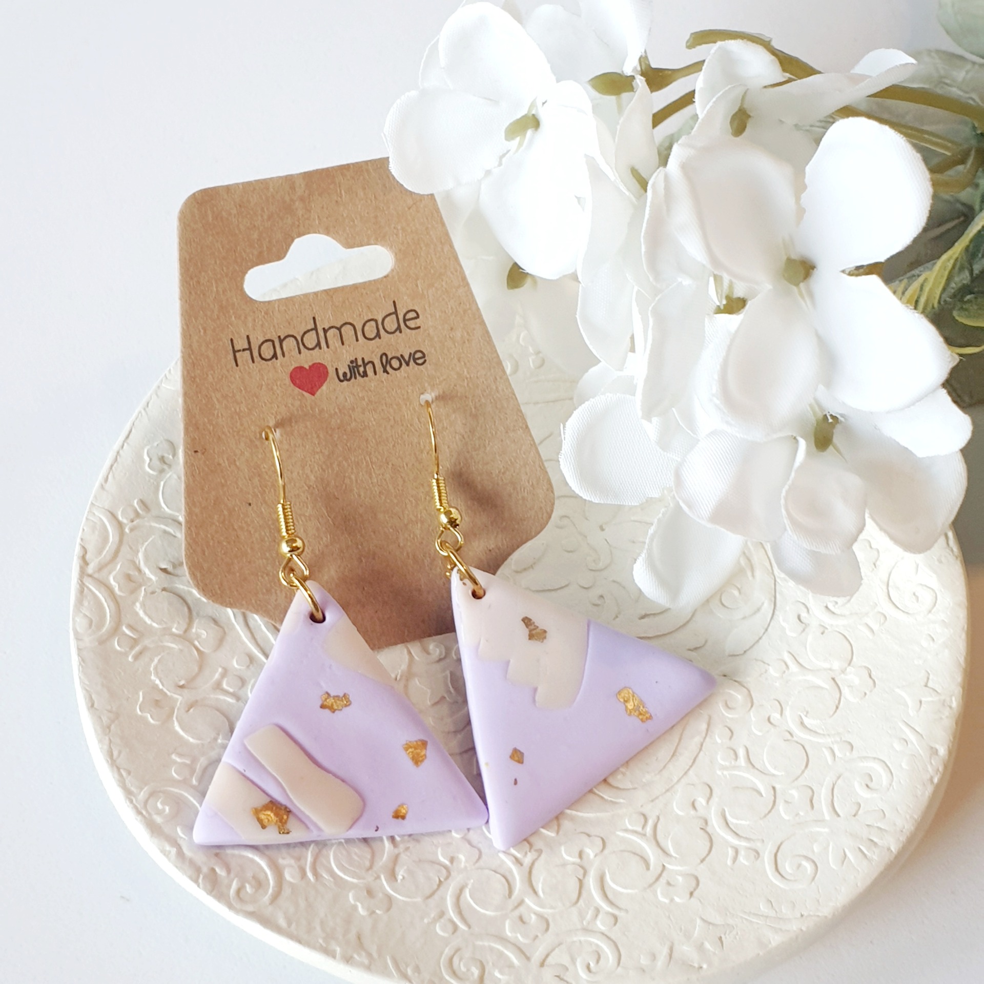 Brincos em formato triangular com mistura de cor com folha de ouro. Leves, elegantes e únicos.