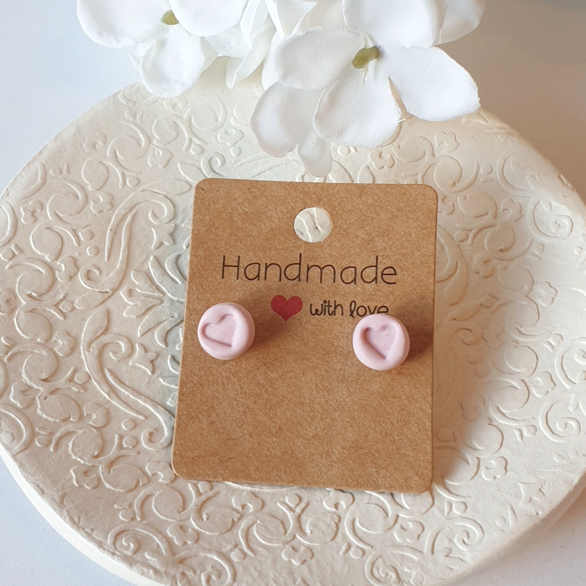 Brincos pequenos com coração no centro, feito a mão com argila polimérica. Um acessório artesanal que combina leveza e durabilidade.