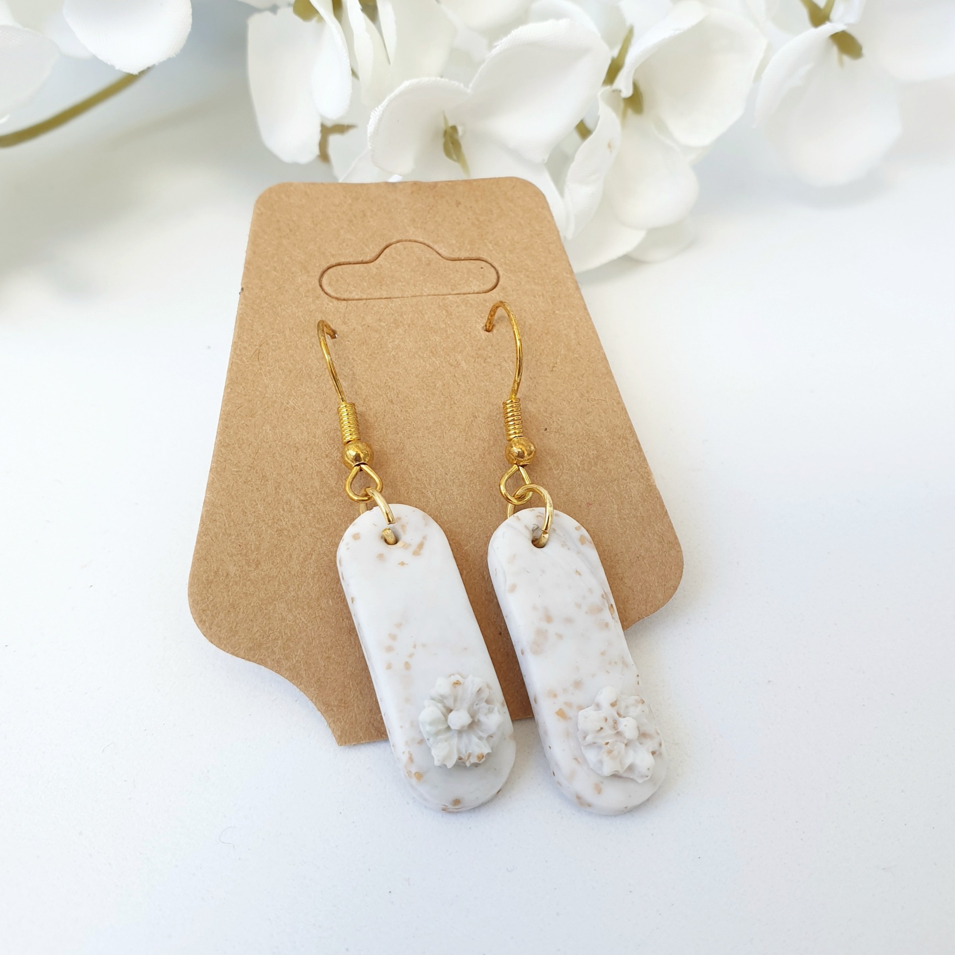 Brincos delicados feitos à mão de massa Fimo. Tem um toque de folha de ouro.