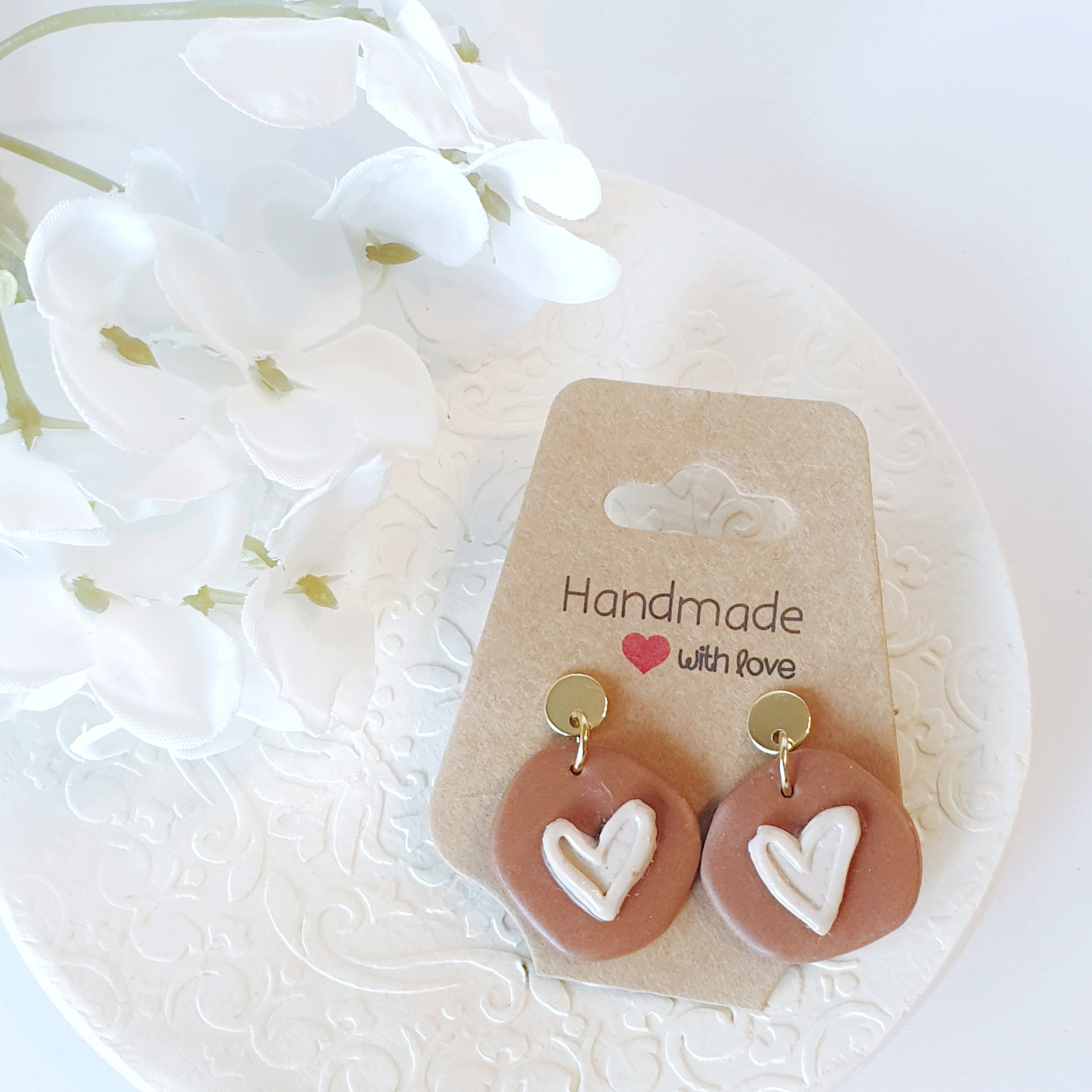 Feitos à mão com argila polimérica castanho com um coração em relevo em bege.Leve e confortável para uso diário.